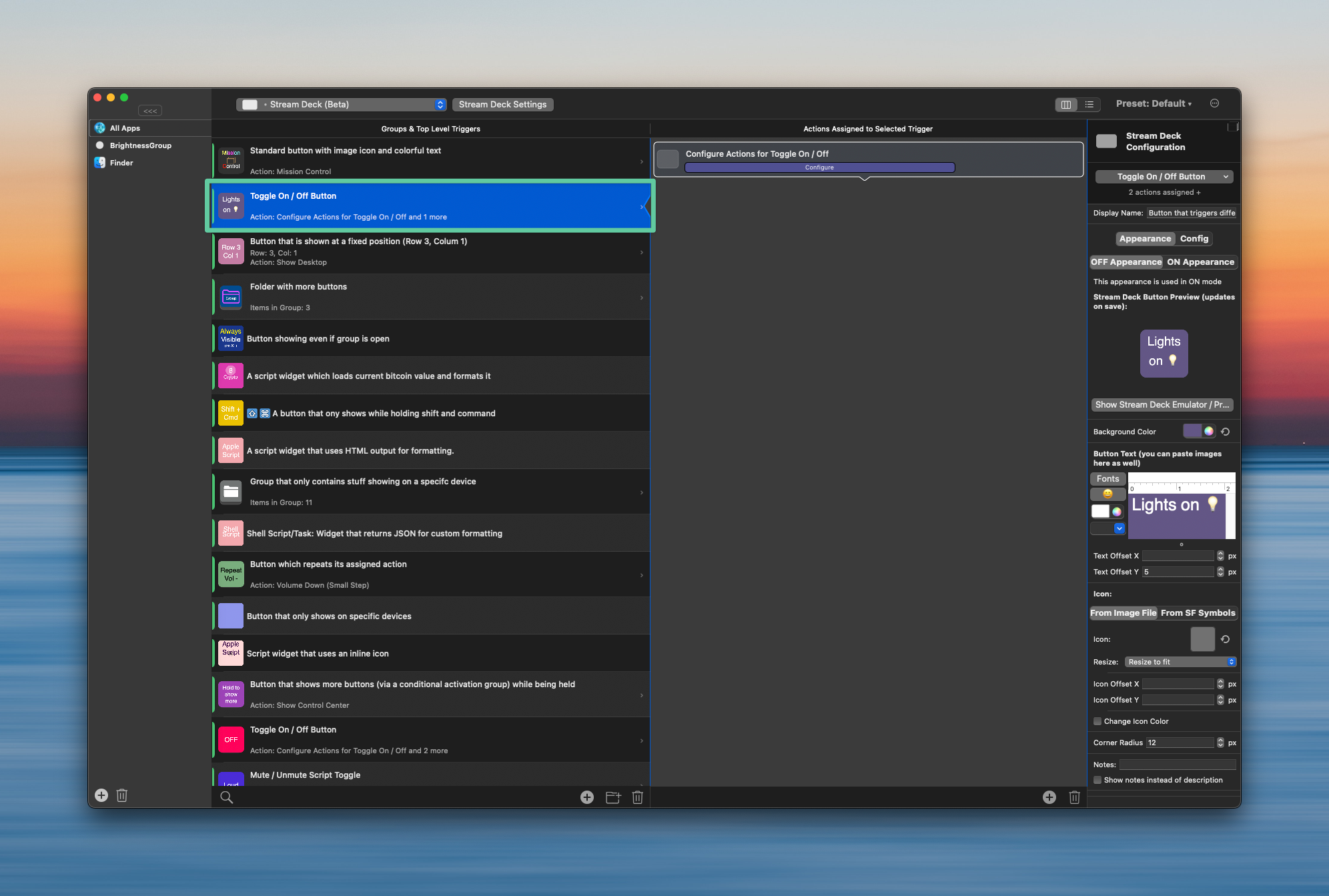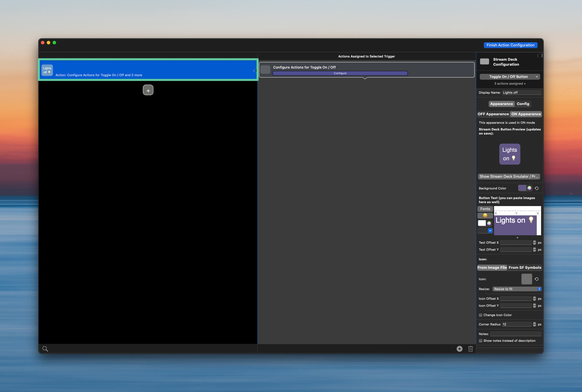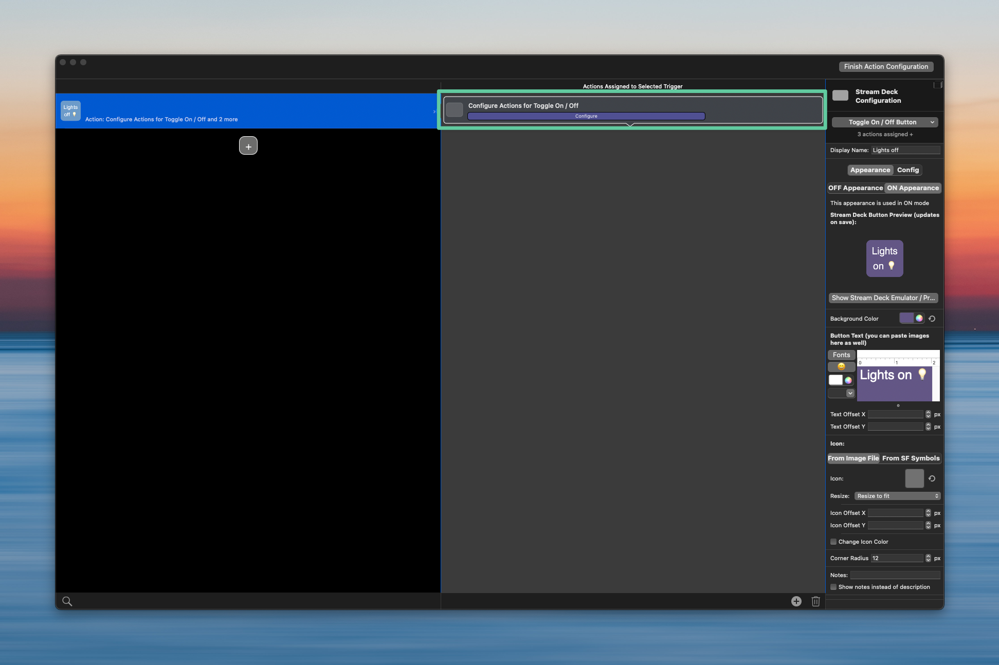Step 2: This is optional, but you can manage the ON or OFF appearance for the button by selecting the action in the left pane and setting up your preferences in the Configure area.