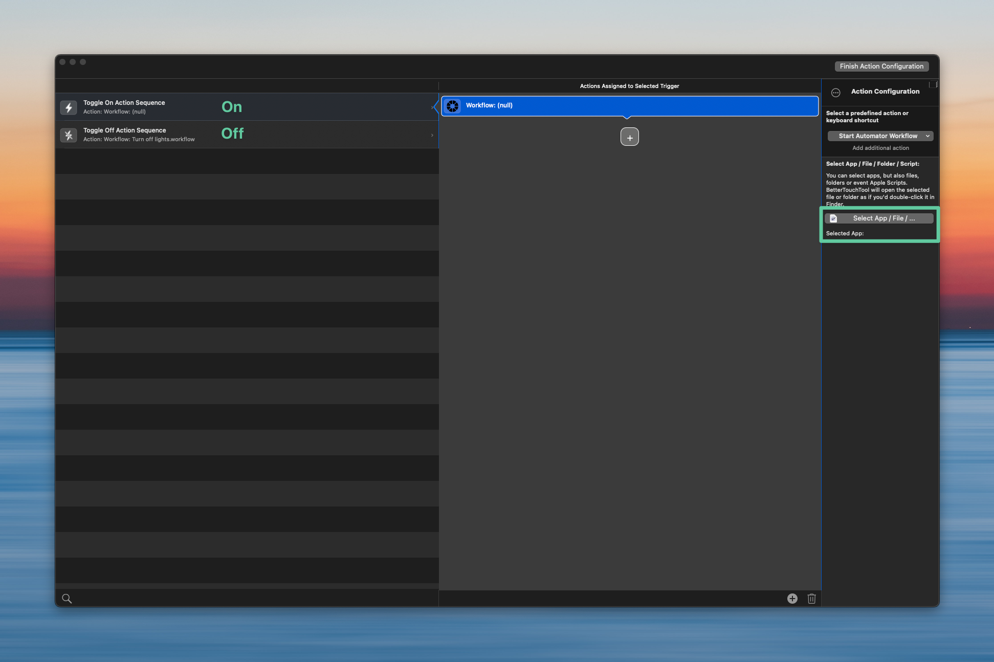 Step 3: Click Configure in the right pane to add your Quick Action workflow to manage the ON and OFF toggle.