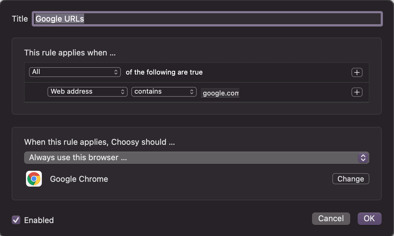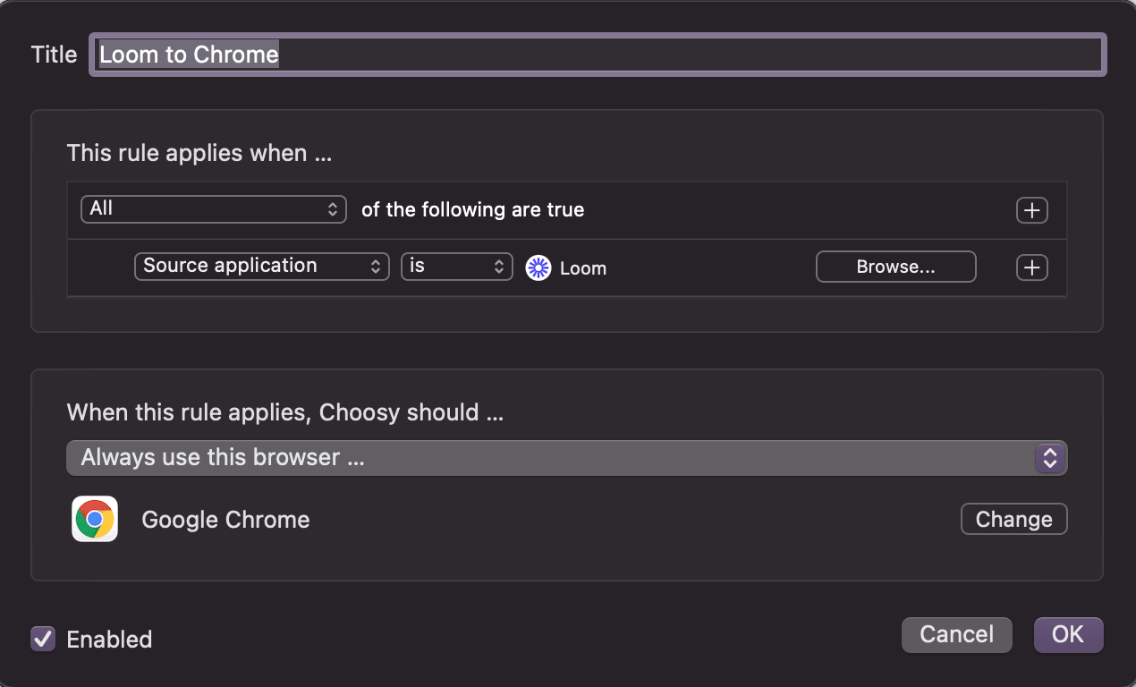 When I tried to sign in to the desktop app it opened in Safari, which is what it should do but it was annoying. When I copied the URL over, I got an error message. I really didn't want to sign in to my Lumi Google account in Safari, so I created a rule for Loom URLs. Any time Loom opens a link, I can send it to Chrome!